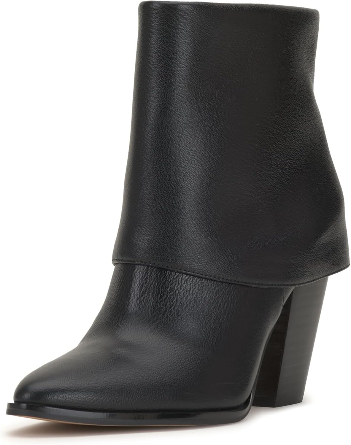 A fold-over cuff creates trendsetting appeal on a luxe bootie framed by an almond toe and stacked block heel.